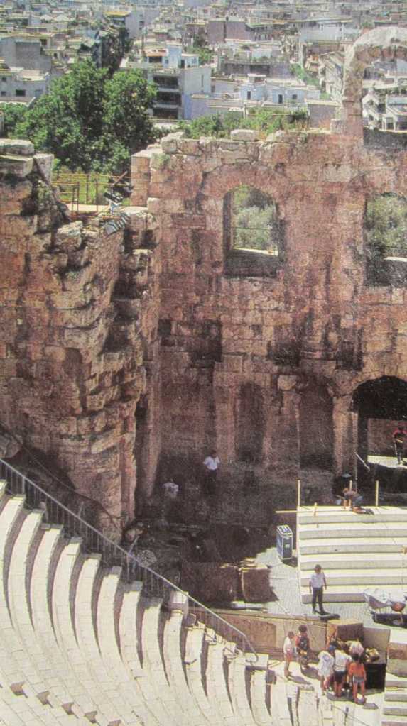 Às nove da manhám: Comprar um chapeu de palha e unhas boas sandálias no Bairro de Kolonaki, e maiormentemente para os ceguinhos também uns óculos de sol. Depois iniciar a visita à Acrópolis, passando antes polo Templo de Zeus e polos Teátros de Dionisos e Herodio (assistir durante os Festivais de Verán de Atenas a unha traxédia clássica ou a unha comédia de Aristófanes, nas ruínas de um velho teátro, resulta unha experiência singular para unha vida humana).