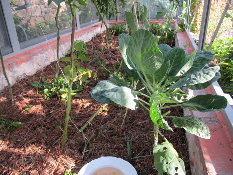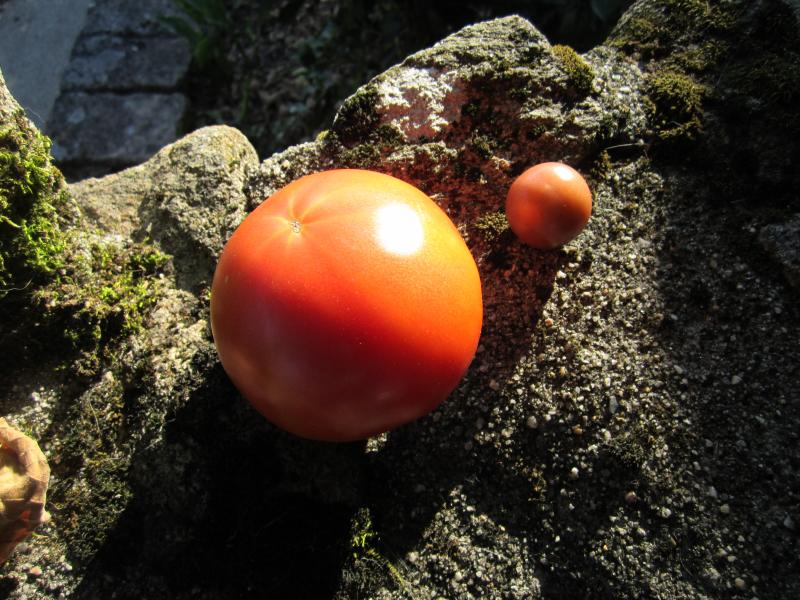 Desta vés prantamos os feixons verdes e os tomates no exterior, contra unha parede de pedra orientada ó sul. Preparamos o chan com unha mistura de abundante esterco de vaca, matéria vexetal e borralha do fogon, o resultado foi deslumbrante os tomates cresceron tanto que pasan de dous metros, acabando por asfíxiar os feixons verdes contr’a parede.