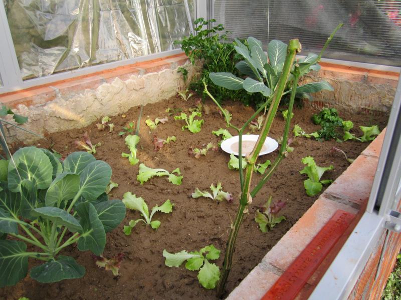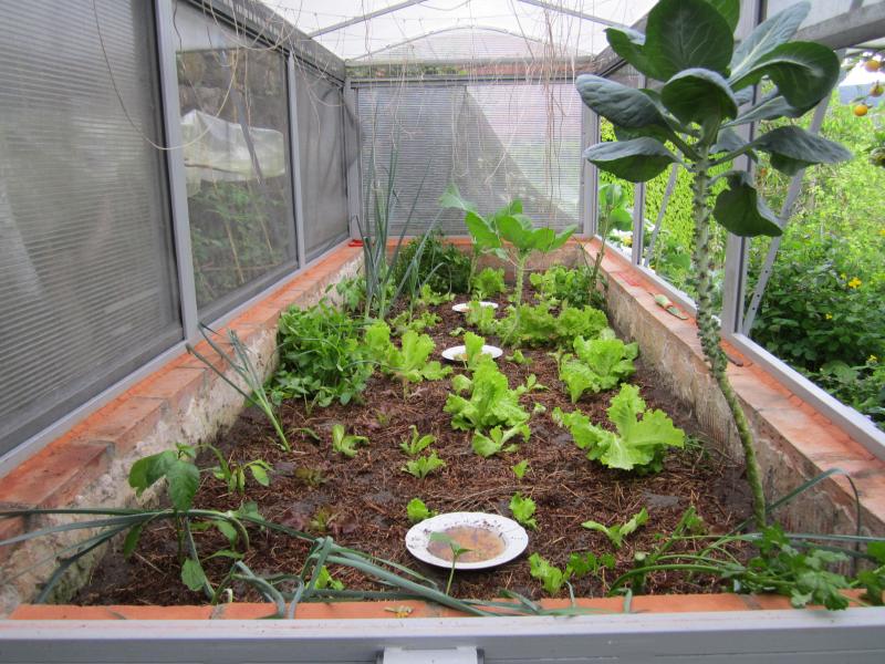 No bancal con invernadeiro sementamos leituga de inverno no mes de xaneiro, e desde mediados de marzo dispoñemos de leituga para comer diariamente. Tamén plantamos fresas en xaneiro e están crecendo e comezando a botar flor.