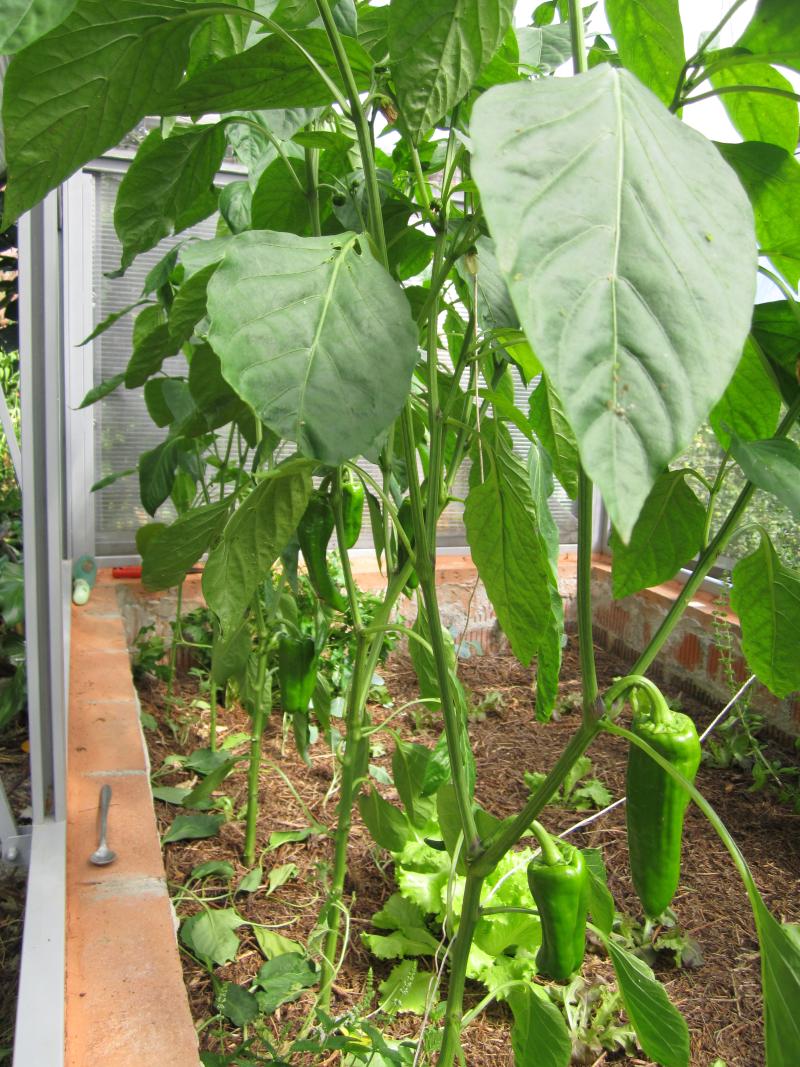 Os pimentos dentro da estufa, prantados contra o lado da sombra para non sacar o sol ás outras prantas. tamen xá estan a saír.